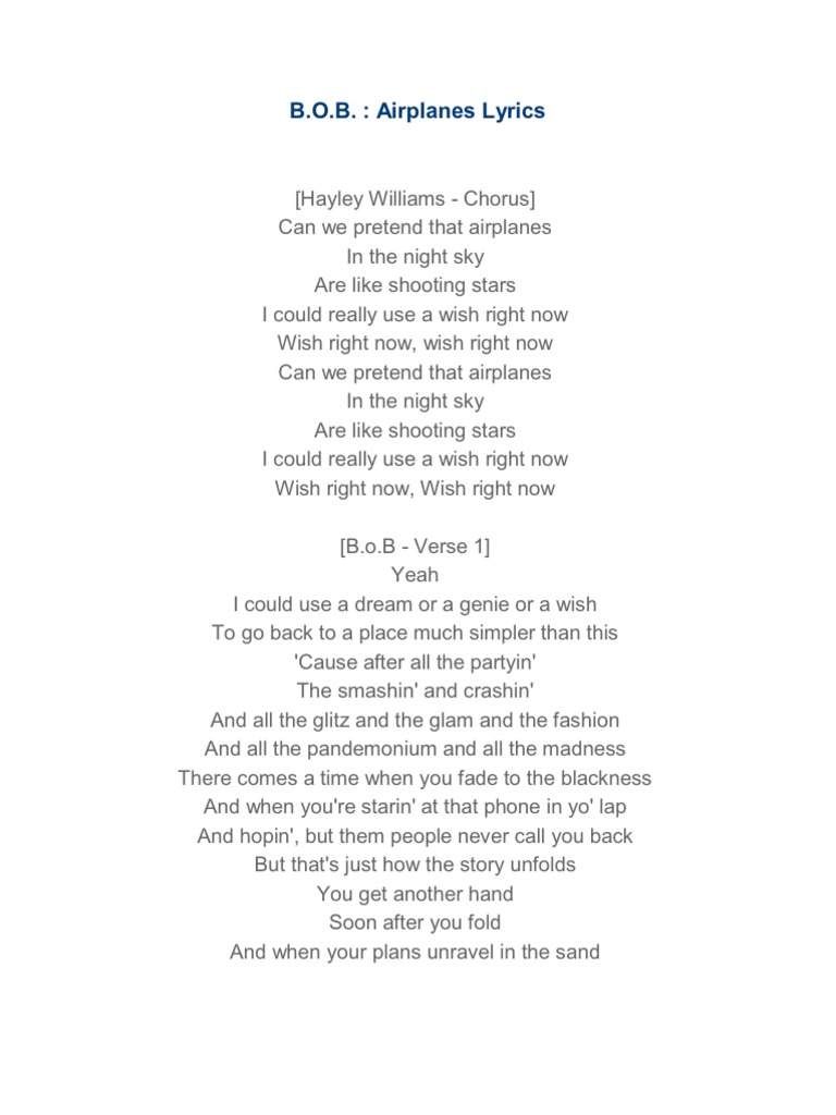 The full quote is can we pretend like airplanes in the night sky, are like you're right, it's way overused. Everytime i've logged into facebook the lyrics are in someone's status. Перевод песни airplanes — рейтинг: 100%(1)100% found this document useful (1 vote). Lyrics :can we pretend that airplanesin the night sky are like shooting stars?i could really use a wish right nowwish right now, wish right nowcan we.